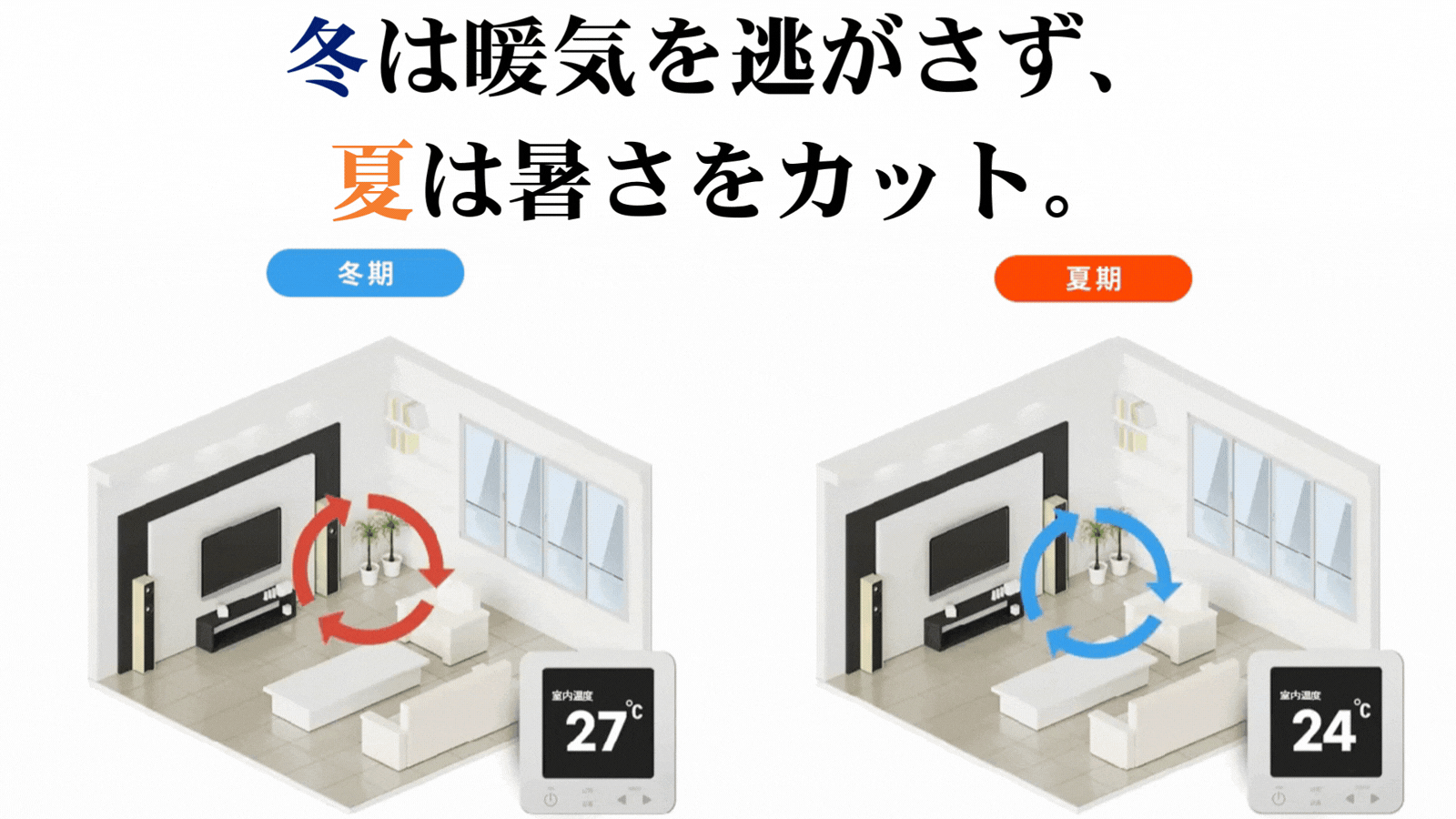 夏は、外からの熱をカットして室内の温度上昇を抑え、冬は暖めた暖気を窓から逃がさないので、 夏は冷房効果が上がり、冬は暖房効果が上がり省エネにつながります。