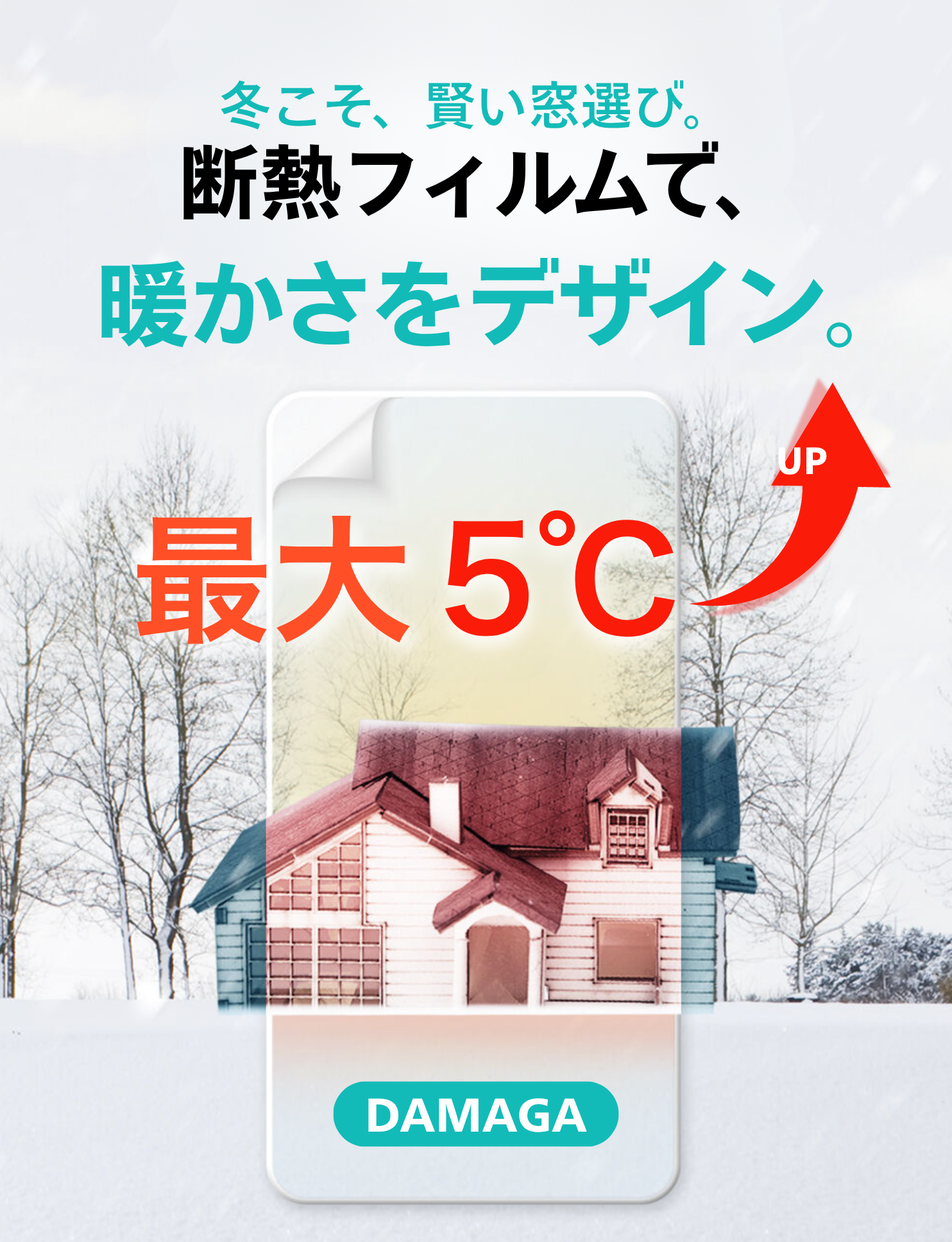 DAMAGAの秘訣!DAMAGAの遮熱・断熱フィルムは、遮熱フィルムが持つ遮熱機能に加え、窓から室内の熱を逃がしにくくします。熱還流率を低く(伝わりにくく)することで、断熱効果を高めているのです!(機関テスト結果6%という結果に)